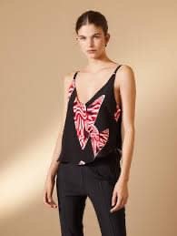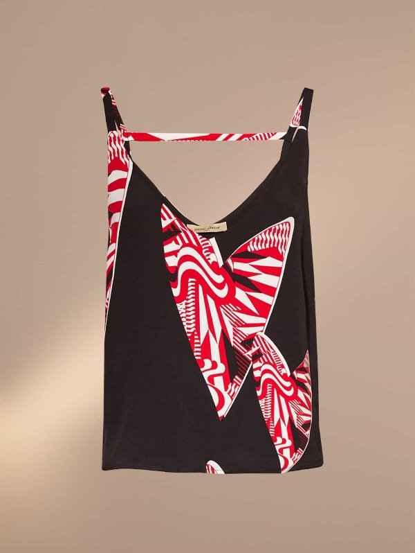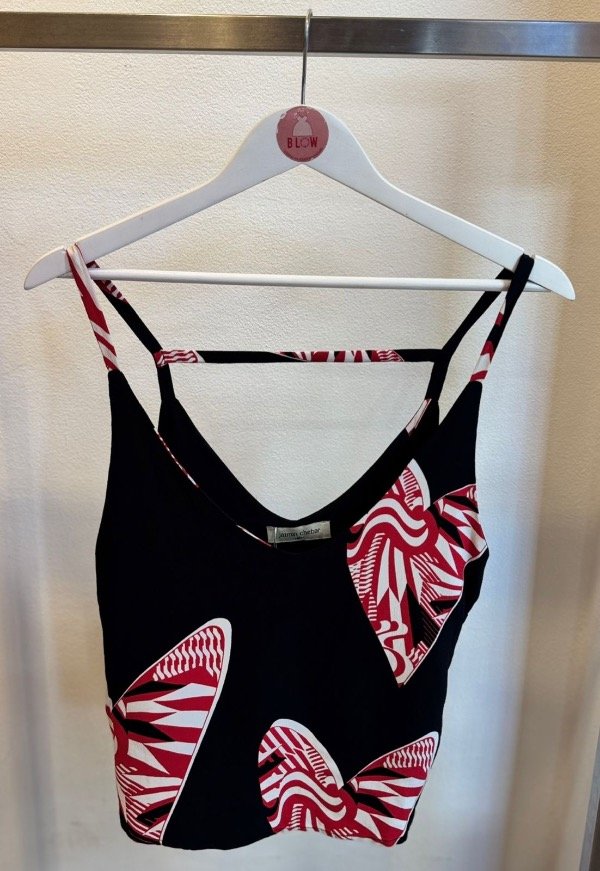 Top estampado escote V con breteles finitos. Espalda al descubierto con tira cruzada horizontal. Largo por arriba de la cadera. Ruedo con forma