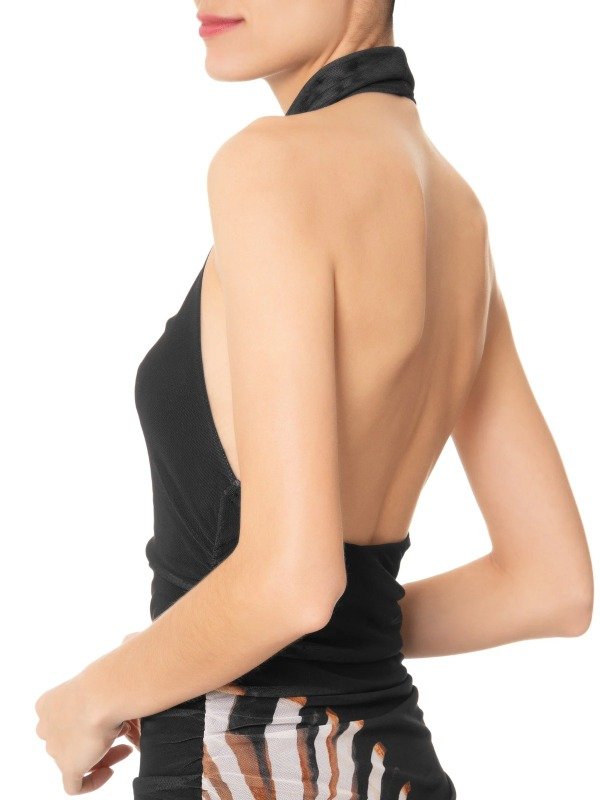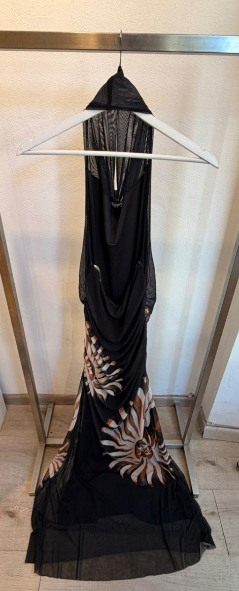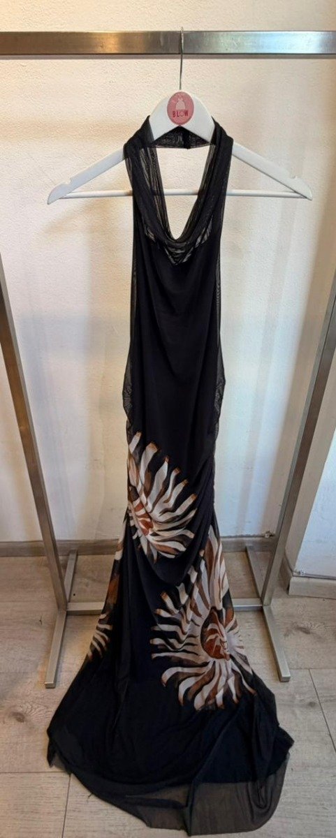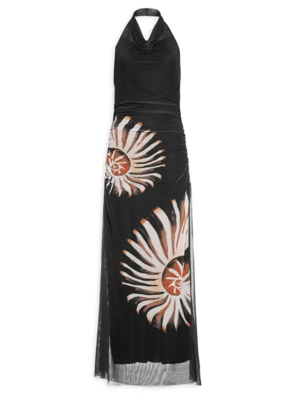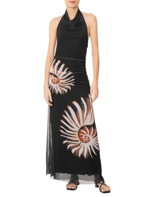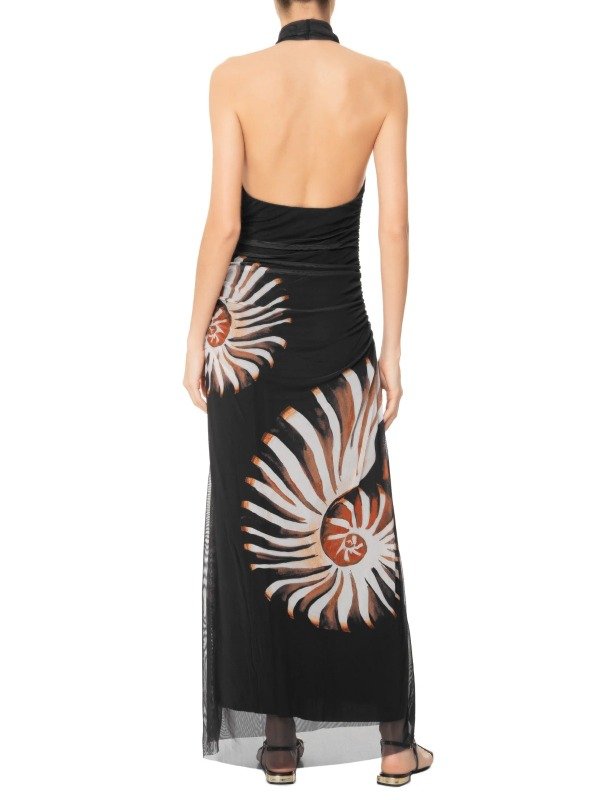 Este vestido negro está confeccionado en tul altamente elástico . La prenda, de corte holgado, presenta escote desbocado, sisas alargadas, escote en la espalda, detalle elástico en la espalda, fruncido con efecto drapeado, estampado figurativo de conchas en colores contrastantes, forro y largo.